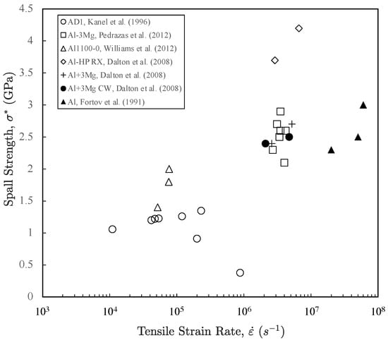 Figure 3. Spall strength as a function of tensile strain-rate determined from time-resolved velocimetry measurements on pure and alloyed Al from the open literature. Reproduced or adapted from [10,11,111,112,113].