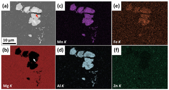 Figure 4. (a) Combined SEM/EDS map analysis of the AZ31B-4E Mg alloy, where: (a) SEM micrograph of the investigated area of the as-received material, (b) EDS elemental map of Mg, (c) EDS elemental map of Mn, (d) EDS elemental map of Al, (e) EDS elemental map of Fe, and (f) EDS elemental map of Zn [13].