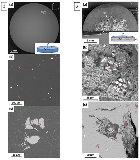 Figure 5. SEM micrographs of the as-received AZ31B-4E Mg alloy sample in backscattered electron contrast (BSE) mode, where: 1(a) investigated sample, 1(b) zoomed-in view secondary phases of Al-Mn, and 1(c) high-magnification of the sample showing a cluster of broken secondary phases of large Al-Mn intermetallic inclusions surrounded by a smaller distribution of the same phase. SEM micrographs (BSE mode) of the mid-plane (spall plane) of the recovered AZ31B-4E Mg alloy sample shock compressed to approximately 1.7 GPa: 2(a) investigated specimen (the red arrow indicates the position of the plane of the specimen under investigation), 2(b) zoomed-in fracture surface at the center of the spall plane with intermetallic inclusions identified by arrows, and 2(c) zoomed-in fracture surface at the edge of the spall plane with intermetallic inclusions [13].