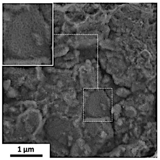 Figure 6. SEM micrograph of the fracture surface in the center of the spall plane revealing nanovoids at the interface between the intermetallic inclusions and the magnesium matrix. The solid box is an enlarged area of the small box [13,144].