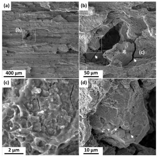 The striated spall surface depicted in Figure 7 is magnified and shown in Figure 8a, the striations are clearly discernible in the horizontal direction. When the pore in Figure 8a (contained by the box marked b) is enlarged even further, it is visible that the spall surface displays brittle-like fracture with just a few remnants of larger cracks (indicated by the arrows), as shown in Figure 8b. Additionally, the area designated c in Figure 8b exhibits a brittle-like phase on the fracture surface (designated as ii in Figure 8c), demarcated from the ductile region by a major crack, which is most likely an intermetallic inclusion. However, a well-developed ductile fracture zone with voids that are nanometer to micrometer in size surrounds this brittle-like phase. Within the voids, only a few precipitates thought to represent intermetallic Al 2 Ca compounds are visible (indicated by the arrows). Another intriguing finding was made by Farbaniec et al. [40] regarding an unusual feature inside the pore (see Figure 8d), and they came to the conclusion that a homogeneous and uniform microstructure is not always produced by the cold compaction process of elemental powder blends followed by hot-extrusion. These kinds of heterogeneity are often undesired and might cause the material to have non-uniform properties. They hypothesized that these microstructural changes in the material had an impact on local variations in spall strength values.