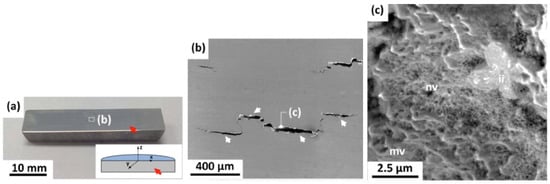 Figure 9. (a) Optical micrographs of the cross-sections of the recovered sample shock compressed to approximately 0.9 GPa, (b) SEM investigation of the damage zone showing isolated cracks within the spall plane, and (c) a view within the crack designated c showing micron-size or largervoid-like features (mv), nanovoids (nv), and intermetallic inclusions (ii) [40].