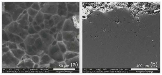 Figure 10. SEM micrographs of the 1100-O aluminum shock compressed to 6 GPa showing (a) dimples on the fracture surface and (b) the cross-sectional view of the fractured sample showing voids below the spall plane [149].