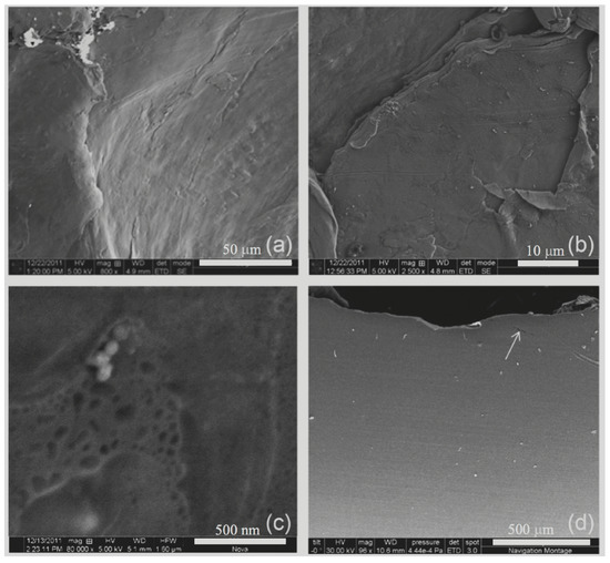 Figure 11. SEM micrographs of the 1100-O aluminum shock compressed to 9 GPa showing (a) intergranular spall fracture surface, (b) an enlarged view of the intergranular spall fracture surface with tongues, (c) nanovoids in isolated areas of the fracture surface, and (d) the cross-sectional view of the fractured sample [149].