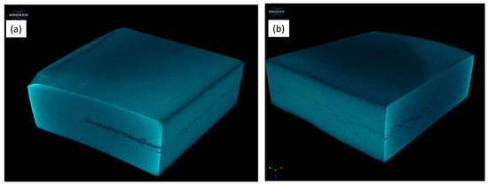 Figure 12. X-ray microCT scans of soft recovered (a) 5083-H321aluminum and (b) 5083-ECAE + 30% CR aluminum samples shock compressed to approximately 1.46 GPa [14].