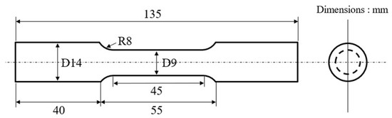 Figure 3 shows a schematic view of the electromagnetic stirrer and the process used to measure the temperature and manufacture a tensile specimen. The process is controlled by changing the method whereby current is supplied to the six-pole electromagnet. Electronic stirring is initiated by the rapid injection of the molten aluminum metal from the heating furnace into the sleeve using a ladle. Simultaneously, as shown in Figure 3a, a thermocouple is inserted into the center of the compartment containing the molten metal to measure the temperature. In the experiments, the temperature of the molten metal in the heating furnace was 700 °C, and that of the molten metal injected into the sleeve was 670 °C. The current input method was set to DC and AC. Once the aluminum material solidified to the desired solid fraction, electronic stirring was discontinued, and the tensile specimen was injected. The manufactured tensile specimens were removed from the stirrer and immediately cooled in water. Figure 3b shows the injection process of the tensile specimen, die, and the shape of the injection product. Two tensile specimens were manufactured in a cavity. Table 2 lists the experimental conditions under which the tensile specimens were manufactured according to the solid fraction and the current input method. The experimental conditions include two current input methods and four different solid fractions, a total of eight conditions that were compared. The solid fractions were 10% (614 °C), 20% (610 °C), 30% (600 °C), and 40% (588 °C). Conditions 1–4 (Table 2) were implemented by setting the current input method to DC, whereas for Conditions 5–8 the current input method was set to AC. A tensile test was conducted to analyze the mechanical properties of the prepared tensile specimens. Figure 4 shows the specifications of the tensile specimens, which were manufactured according to the ASTM E8M standard with a gauge length of 45 mm and a diameter of 9 mm.