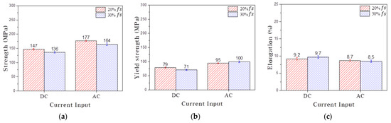 Figure 7 compares the mechanical properties of the tensile specimens in the form of a bar graph. As shown in the figure, the tensile strength improved by 20% when using an AC, rather than a DC, as the current input method. Apart from this, a solid fraction of 20% improved the tensile strength by 8% compared to a solid fraction of 30%. The elongation decreased by 0.5 to 1.2% when using an AC compared to a DC.