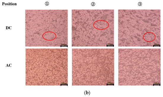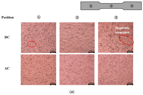 Figure 8 shows the microstructure at the different positions on each tensile specimen according to the current input method and solid fraction. The images were taken with the optical microscope. Figure 8a shows the microstructure of the tensile specimen according to the current input method when the solid fraction was 20%. In the case of the DC input, as shown for positions 1 and 3, marked in red, the solid particles of A356 are coarse, and irregular solid particles are combined to form a dendritic structure. On the other hand, the solid particles of A356 obtained via the AC input are finer and are spherically shaped. Although irregular particles were observed, they did not form dendritic structures. Figure 8b shows the microstructure according to the current input method at a solid fraction of 30%. For the DC input method and a solid fraction of 30%, irregular solid particles and dendritic structures were formed at positions 1, 2, and 3, marked in red. However, the microstructure obtained using the AC input method did not contain dendritic structures and the A356 particles were fine and spherical in shape.