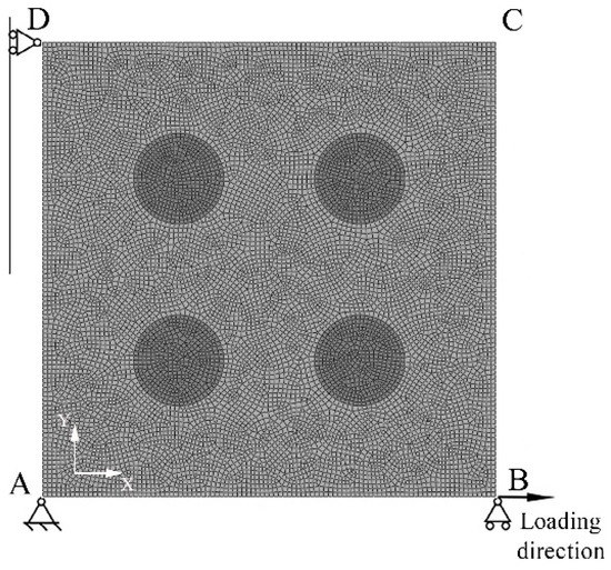 The particles and matrix were meshed with 4-node bilinear plane strain quadrilateral reduced integration elements. The mesh was a 2D quad-dominated free mesh, and mapped meshing was used where appropriate to improve mesh quality. While ensuring mesh convergence, the finer the mesh division, the smaller the effect on the finite element simulation results. The maximum element size was 0.462. The number of elements in the model was 11,825 and the number of nodes was 11,847.