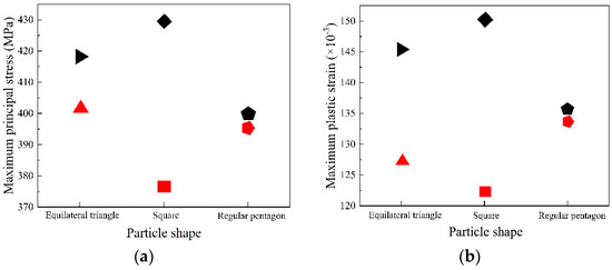 The effect of particle orientation on the composite is first analyzed. Figure 3 shows the maximum principal stress and maximum plastic strain inside the composite when doping the same particle shape but with different particle orientations. We find that particle orientation has a significant effect on the stress and strain inside the equilateral triangular particle- and square particle-reinforced composites and a slight effect on the regular pentagonal particle-reinforced composites. We conclude that the higher the internal stress level of the composites, the better the particles enhance the mechanical properties of the composites, and this allows us to determine particle orientation.