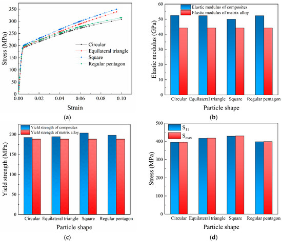Figure 4a shows the stress–strain curves of composites doped with different SiCp particle shapes. The stress–strain curves of composites do not vary significantly during the elastic deformation stage. The stress–strain curve of the square particle-reinforced composite has a significant rise during the plastic deformation stage. Figure 4b shows the elastic moduli of composites doped with different SiCp particle shapes, which were obtained by calculation and compared to the elastic modulus of the WE43 matrix alloy (44.2 GPa). The elastic moduli of all kinds of composites are higher than that of the WE43 matrix alloy, indicating that SiCp particle doping provides an enhancement in stiffness for the WE43 magnesium alloy. Moreover, the round particle-reinforced composite has the highest elastic modulus of 52.48 GPa, and the square particle-reinforced composite has the lowest elastic modulus of about 50 GPa.