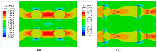 The damage is likely to initiate at the interface between the matrix and particle, at the location of the highest stress concentration, as shown in Figure 6. This phenomenon is more prominent in polygonal particle-reinforced composites. Moreover, we found that the S11 value at the location of the highest stress concentration is very close to Smax, as shown in Figure 4d. Therefore, we initially speculate that the internal damage of the composites under tensile loading along the X-direction is likely to be dominated by S11.