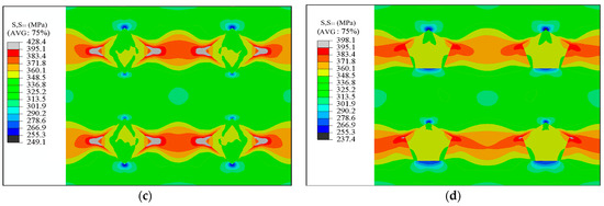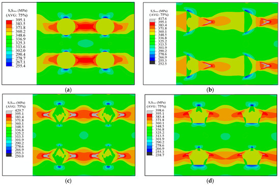Smax distribution of the composite models with different SiCp shapes: (a) round particle doping; (b) equilateral triangle particle doping; (c) square particle doping; and (d) regular pentagon particle doping.