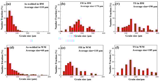 The WM recrystallized grain analysis of the as-welded and heat-treated samples was carried out to make clear the evolution of the microstructure during the thermal shock process, as shown in Figure 6. The WM of the as-welded and FH samples are mainly comprised of sub-grains with small recrystallized grains, as shown in Figure 6a,b. However, the TS samples were mainly comprised of recrystallized grains (77%). This phenomenon supports the hypothesis that the AGG was generated by recrystallization in the thermal shock process.
