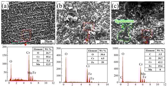 The surface morphologies and the EDS on the surfaces of the welded metals after thermal shock at 1100 °C for different durations are shown in Figure 10. Significant amounts of oxide particles rapidly formed on the surfaces of the samples after a duration of only 1 h, as shown in Figure 11a. The sizes of the oxide particles increased with the exposure duration, as shown in Figure 11b,c. Moreover, there are some spallation areas that emerged in the oxide scales for the 10 h duration samples at 1100 °C. This phenomenon indicates that the 310S welded metals suffered from oxide spallation after thermal shock at 1100 °C during the long-term bottling process. The grey particles mainly contain the elements Cr, Fe, Mn, O, and C, as shown in Figure 11, which presents that the grey particles are mainly spinel oxides (Fe, Cr, Ni)3O4 and Cr2O3.