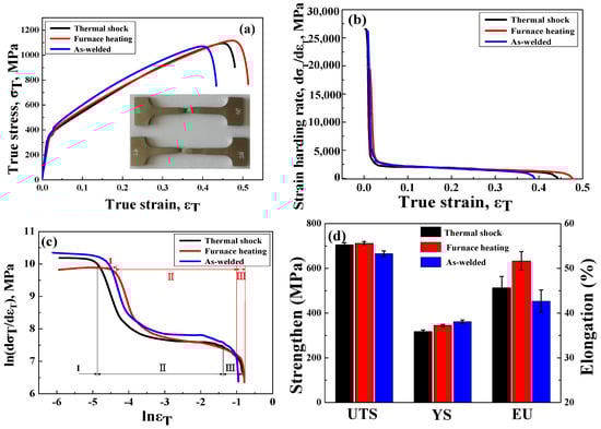 Changes in the mechanical properties of the TS and FH samples (for 6 h durations) and the as-welded samples, respectively. (a) True stress–strain curves. (b) Strain hardening rate–true strain curves. (c) The C–J analysis (ln (dσT/dεT) vs. lnεT). (d) Distribution histograms of the mechanical properties.