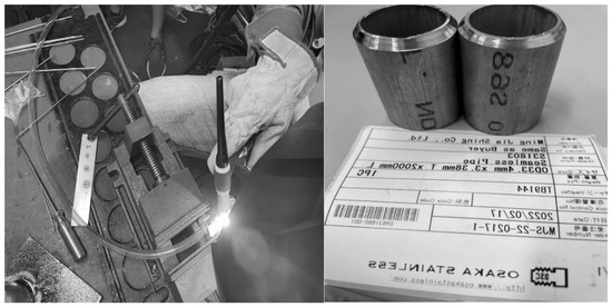 where y denotes measurable response statistic, represents the sample mean, and s2 is the sample variance of n units. The Taguchi method’s parameter design will first use the L8 orthogonal table to identify four crucial factors and two levels for factor testing to confirm each factor’s contribution; then, the L9 orthogonal table will be used to identify four factors and three levels of the orthogonal table for precise experiments. In the experiment, UNS31803 duplex stainless steel was used as the base material, the welding method was the GTAW process, and ER2209 stainless steel welding rods were used as the welding consumables. S31803 duplex stainless steel is a hollow stainless steel thin round tube assembly of ø33.4 (mm) × t3.38 (mm) × L50 (mm), welded with S31803 solid rod for duplex stainless, ASME AWS SFA-5.9 ER2209 × ψ2.4 (mm). The welding method uses the GTAW process and ER2209 stainless steel electrodes as the consumable rod. The chemical composition requirements of the UNS S31803 base metal and ER2209 filler are shown in Table 1 and Table 2. The actual welding process is shown in Figure 1.