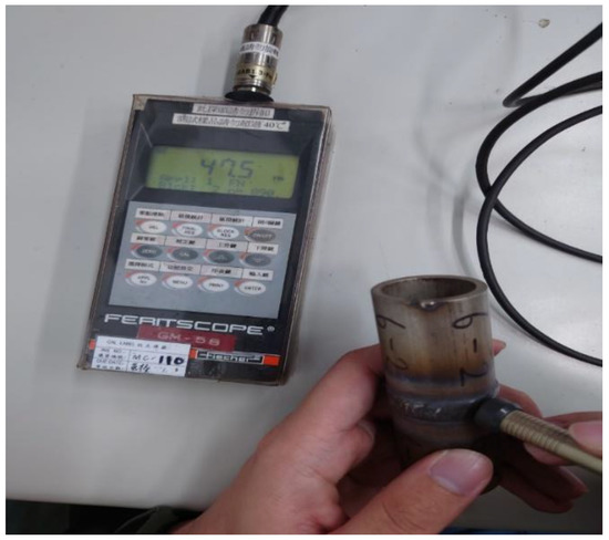 After the experimental plan completes the welding test piece, the workpiece’s weld bead’s outside and interior will be examined. The metallographic structure of the weld bead, base metal, heat-affected zone (HAZ), and hardness data is helpful for subsequent data analysis using the Taguchi method. Sandpaper is used to remove the surface-attached oxides and oil stains from the test piece’s inspection points. The surface of the weld bead, the heat-affected zone’s surface, and the test piece’s base metal is measured next using the ferritic rate meter. the percentage of ferrite iron (called α-Fe content) on the surface is found, followed by taking the average of five measurements in the same spot. To get the correct measurement value when using the ferritic rate meter, the measuring rod needs to be kept perpendicular to the measuring surface, as demonstrated in Figure 2. We give the data and S/N ratio calculated by Equation (4) in Table 4.