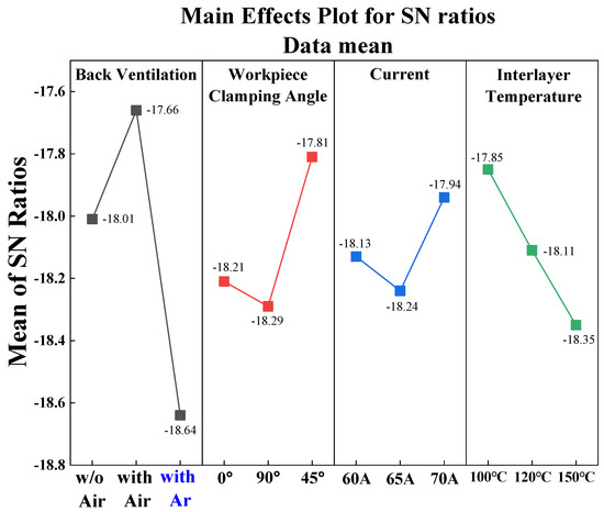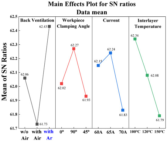 - The data were obtained from the welding test by arranging the combinations in Taguchi’s direct cross-tabulation table. After compiling them, Taguchi analyzed each control factor’s data. The combination of A3, B2, C2, and D1 (backing gas with argon gas, workpiece clamping angle 90°, current 65 A, and interlayer temperature 100 °C) with the α-Fe content of 57.00% and tensile strength of 1453 MPa is the stable combination with the better Vickers hardness quality.