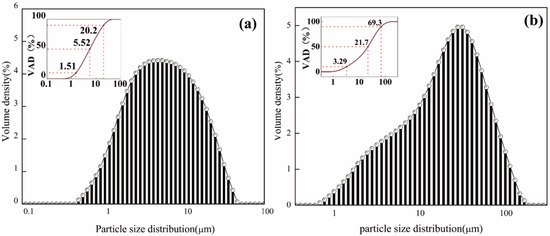 The treated BFS and FGDG were analyzed with a CZB-9 BET Automatic Specific Surface Area Analyzer, Beijing, China, and the specific surface areas were 500 and 450 m2/kg, respectively. The particle size of the raw materials was analyzed by a LMS-30 laser diffraction scattering particle size distribution analyzer, Beijing, China. As seen in Figure 1, the volume accumulative distribution (VAD) of 10, 50, and 90% of different raw materials was displayed on the upper left corner of the particle size distribution.