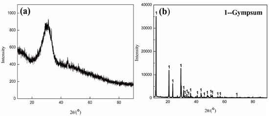 The XRF test results of raw materials were analyzed by a XRF-1800 sequential X-ray fluorescence spectrometer, Shenzhen, China and is shown in Table 3. BFS was mainly composed of Ca, Si, Mg, and Al elements. As shown in Figure 2a, the XRD pattern of BFS displayed a distinct broad band, indicating the predominant amorphous nature of the BFS. In addition, a small contribution of crystalline CaCO3 was found. The performance indices of BFS could be calculated from chemical compositions based on Equations (1)–(3), for hydraulic activity, the activity coefficient, and alkalinity coefficient, respectively. The calculated values suggested that the BFS could be considered a high-quality slag with high activity and neutral alkalinity.