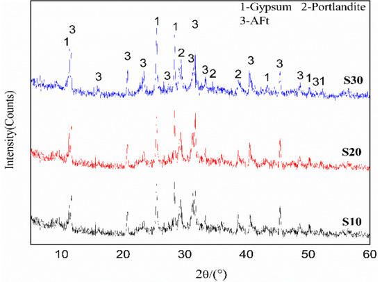 In order to determine the solidification mechanism of ettringite on Cr, XRD patterns of three different samples were analyzed to study the effects of K2CrO4 on the crystalline shape and lattice of ettringite. As shown in Figure 3, there was no significant difference in the XRD diffraction patterns of different samples, and the main hydration product was ettringite. However, with the increase in K2CrO4 content, the diffraction angle of ettringite slightly increased due to the replacement of SO42− by CrO42− in the liquid phase to form chromate ettringite. The binding ability of CrO42− to components, such as Ca2+, Al(OH)4− and OH−, was poor, leading to an increase in the phase distance of each product. However, as SO42− and CrO42− had the same valence state and similar particle sizes (2.3 Å and 2.4 Å) [17], the XRD patterns of each sample did not display many differences. In addition, the intensity of the derivative peaks of CaSO4 increased with the increase in K2CrO4 content, which was generated by the reaction of SO42− with Ca2+ in the solution. In order to verify the above results, the concentrations of SO42− and CrO42− in the leachate of different samples, after curing for 28 days, were determined by ion chromatography and spectrophotometry with colorimetric method.