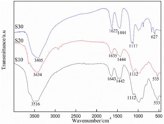 The effects of different amounts of K2CrO4 on the chemical bonding and molecular structure of the ettringite were investigated by FTIR analysis. As shown in Figure 4, with an increase in K2CrO4 content, the absorption bands centered around 3452 cm−1 and 1639 cm−1 were reduced, and the stretching vibrations of the S-O bond in ettringite near 1116 cm−1 significantly decreased.
