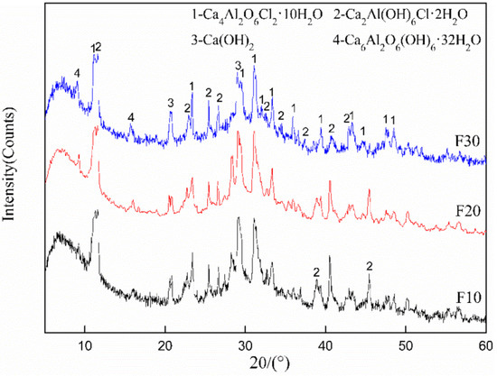 The XRD patterns of samples F10, F20, and F30 were tested to reveal the effect of K2CrO4 doping on the crystalline shape and lattice of Friedel’s salt, verifying its solidification mechanism of Cr. As shown in Figure 6, there was no distinct difference in the XRD patterns of different samples. With an increase in K2CrO4 content, the diffraction peak position of Friedel’s salt changed to a certain extent, but the intensity seemed to be unchanged, indicating that once the Cr entered the crystal of Friedel’s salt to make varied forms, the total amount was unchanged. The leaching concentrations of Cl− and CrO42− in the leachate of different samples were investigated by the horizontal vibration method, and the results are shown in Table 6. The concentration of CrO42− in the leachate slightly increased with the addition of K2CrO4, suggesting that part of the CrO42− entered the Friedel’s salt crystals for solidification and that the content of soluble Cr was reduced. Meanwhile, the Cl− concentration also slightly increased, but with no apparent regularity. These results suggest that an increase in CrO42− content led to the dissolution of partial Cl− from Friedel’s salt. This can be due to two reasons: (1) the Cl− was replaced and released into the solution, thus generating Friedel’s salt with more chlorine as Ca4Al2O6Cl2∙10H2O; (2) the Cr in Friedel’s salt were not only replacing Cl− with anions for solidification but were also reduced from Cr6+ to Cr3+ and solidified as cations.
