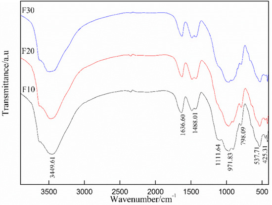 The effect of K2CrO4 addition on the chemical bonding and molecular structure changes of Friedel’s salt was investigated by FTIR analysis. As shown in Figure 7, as K2CrO4 content increased, the FTIR spectra of different samples hardly changed, and the absorption bands centered around 3450 cm−1 and 1637 cm−1 were basically unchanged with a slight reduction in the transmittance. This indicated that the doping of CrO42− exerted a slight effect on the generated species of Friedel’s salt, but the total amount of Friedel’s salt was basically unchanged, which was demonstrated in Section 3.3.1. This was due to the generation of Friedel’s salt with different atomic compositions. The weak absorption at 1112 cm−1 indicated that almost no ettringite was formed. In addition, there was no significant difference in the number and intensity of vibration peaks in the absorption bands of Friedel’s salt around 538 cm−1 and 425 cm−1. The weak absorption band located near 1488 cm−1 was also caused by the carbonization of CO2, and remained unchanged with the addition of Cr.