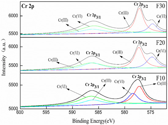 XPS patterns of Cr in different samples (F10, F20, F30).
