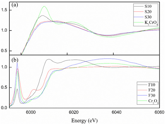 XANES patterns of Cr in different samples (a) S10, S20, S30; (b) F10, F20, F30.