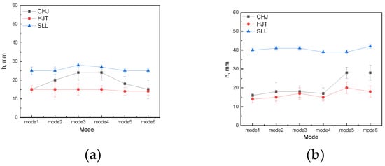 The liquid-level height of different modes at two different casting speeds with or without solidification in three hydraulic jump forms is shown in Figure 10. It can be seen that the average liquid-level height in SLL increases with the increase in the casting speed in general, and the liquid-level height in HJT has little relationship with the mode and solidification.