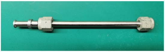 An aircraft 1Cr–18Ni–10Ti stainless-steel hydraulic thin-walled pipe was selected for the experiment, as shown in Figure 1. The diameter of the pipe was 8 mm, and the wall thickness was 0.8 mm. The mechanical characteristics of stainless steel, referring to GB/T 3280-2007 “cold rolled stainless steel plate, sheet and strip”, are shown in Table 1. ρ is the density of the material, σ is the tensile strength, σ0.2 is the yield strength, E is the elastic modulus, and ν is the Poisson’s ratio.