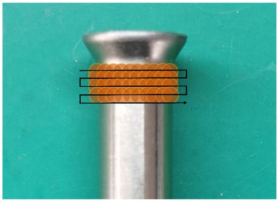 The yd60-r200b LSP equipment manufactured by the Tyrida Optic Electric Technology (Xi’an, China) company was used in the experiment. The pulse was 20 ns, the wavelength was 1064 nm, and the repetition was 1.5 Hz. Laser parameters were set to 3 J of energy and a 1.1 mm spot diameter for the LSP. The scanning route was a zigzag laser path, and the light-spot overlap rate was 50%, as shown in Figure 2.