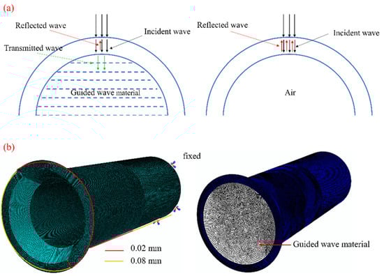 Because the stress wave is reflected and coupled several times within the thin-walled part to generate a complicated wave system, the effect of LSP is also influenced by the stress wave. As a result, the elastomer-guided wave material was filled in the pipe to lessen the negative effect induced by stress wave reflection. Figure 3 depicts a schematic model of the shock wave propagation of LSP when packed with guided-wave material (a). To lower the interface’s reflected acoustic impedance, the material should have qualities comparable to stainless steel. The guided wave material in the simulation was specified to be an elastomer with the same density, elastic modulus, and Poisson’s ratio as stainless steel, and the parameter values are provided in Table 3.