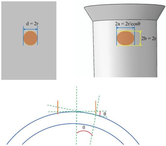 The laser causes geometric distortion on the curved surface, elongating the projection shape of the laser spot into an ellipse on the curved surface. Figure 4 is a schematic diagram of the spot distortion. When the same laser parameters are used, the laser energy, acting via a single pulse, remains constant, resulting in variations in the real laser power density. According to the principle of equal energy, the power density calculation formula is modified as follows: