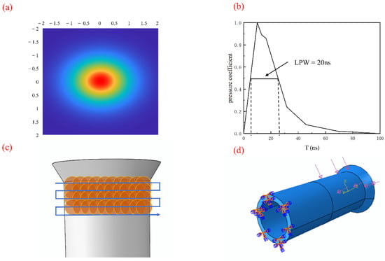 where P (r,t) is the shock wave pressure at a certain point and moment, Pmax is the peak pressure of the shock wave, and P(t) is the time amplitude curve (Figure 5b), simplified according to the study findings of laser impulse pressure by Peyre [36], r is the spot radius, and r is the distance from a certain point to the spot center. A VDLOAD Fortran subroutine was used to apply the pressure-loading of the laser impacts, considering the zigzag laser path (Figure 5c), with a 50% spot overlap rate. The boundary conditions are shown in Figure 5d; the cross-section of one side of the pipe was set to ENCASTRE (U1 = U2 = U3 = UR1 = UR2 = UR3 = 0), with user-defined pressure being applied to the pipe’s surface.