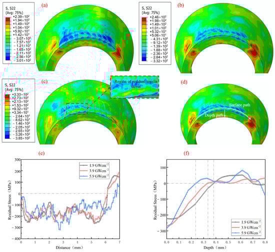 Residual stress nephogram and residual stresses in surface and depth directions of different power density: (a) 1.9 GW·cm−2, (b) 3.9 GW·cm−2, and (c) 5.9 GW·cm−2; (d) residual stress numerical extraction path; (e) residual stresses in the surface direction; (f) residual stresses in the depth direction.
