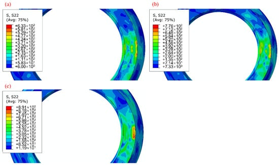 Higher laser-power density increased the plastic strain and, therefore, increased the residual compressive stress. However, the component was a thin-walled pipe and the propagation of stress waves within the component was extremely complicated, resulting in an uneven distribution of residual stress. The stress wave propagation of the final hit was chosen for study, and the findings are illustrated in Figure 7. It can be seen that the maximum von Mises stress on the top surface, as reflected by 5.9, 3.9, and 1.9 GW·cm−2, was 891, 776, and 633 MPa. It is clear that the larger power density still had a stronger stress wave after reflection, thereby still producing plastic strain on the material; thus, some residual tensile strain occurred on the surface under the operation of 5.9 GW·cm−2.