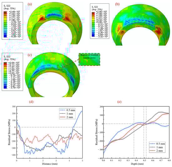 Residual stress nephogram and residual stresses in the surface and depth directions of different spot diameters: (a) 0.5 mm, (b) 1 mm, and (c) 2 mm; (d) residual stresses in the surface direction; (e) residual stresses in the depth direction.