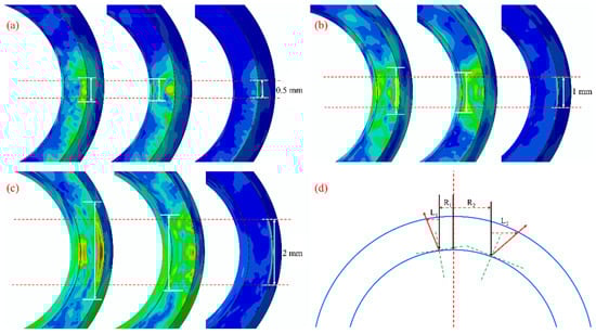 Figure 8 shows the stress wave propagation of the pipe (Figure 8b), compared with the plane member (Figure 8a). It is obvious that the stress wave propagating over the curved surface had a horizontal extrusion; the horizontal component decreased as the diameter of the spot decreased (Figure 8c). The effect of various spot sizes on the pipe’s residual stress has been investigated in this paper.