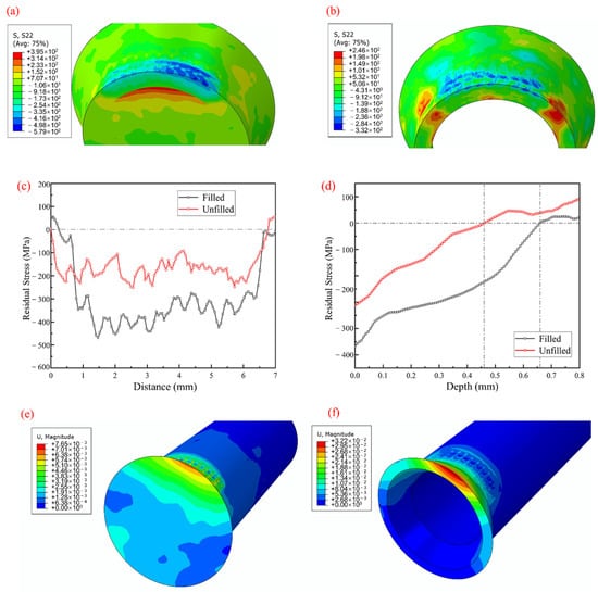 Although various power densities and spot sizes were investigated, seeking the optimal laser parameters, the intense stress wave after reflection in the thin-walled pipe resulted in an uneven distribution of the residual compressive stress field. As a result, the pipe was filled with a guided wave material to minimize stress-wave reflection and enhance the residual stress field. The residual stress nephogram and residual stresses in the surface and depth directions of filled and unfilled guided wave materials are presented in Figure 11. As can be seen in the image, the filled guide material increased the maximum residual stress of the surface residual stress to −578 MPa, which was 70% more than the value for the pipe without the filled guide material.