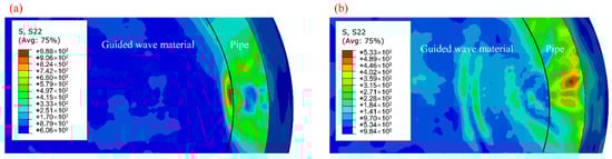 After filling with the guided-wave material, the reflection of stress waves in the thin-walled pipe was minimized. As shown in Figure 12, the stress wave propagation of the most recent hit was chosen for investigation. When the stress wave reached the bottom surface, the majority of the wave propagated through the interface and into the guided-wave material. With continuous stress wave propagation, the energy of the stress wave was lost throughout the propagation process in the guided-wave material, and it was difficult to affect the material’s plastic strain during subsequent propagation. Thus, the LSP’s effect on the thin-walled pipe could effectively be improved by filling it with guided-wave material.