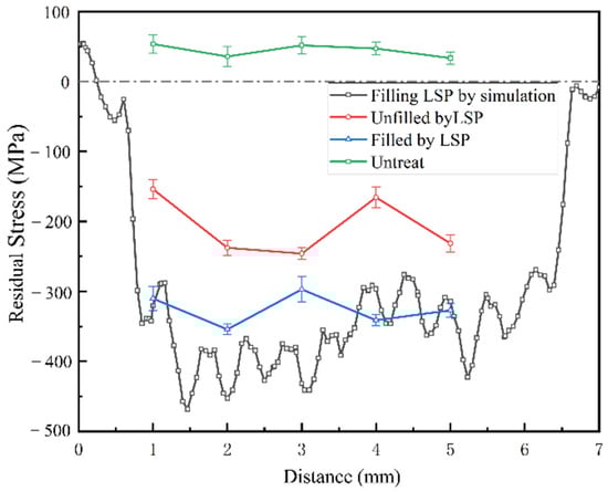 Figure 13 depicts the experimental and simulation findings for surface residual stress; five test points were selected in the circumferential direction of the surface with an interval of 1 mm. LSP caused a significant residual compressive stress in the impact zone. The untreated samples had an average surface residual stress of 44.22 MPa. The unfilled guided-wave material samples had an average surface residual stress of −206.93 MPa. The average surface residual stress of the filled guided-wave material samples was −326.06 MPa, with a 7.8% inaccuracy when compared to the numerical simulation’s average surface residual stress of −351.76 MPa. Overall, the numerical simulation results were mostly similar to those of the experiments. The numerical value of the residual stress and the uniformity of residual stress distribution on the surface of the thin-walled pipe were effectively improved by filling with LSP.