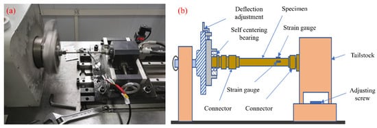 Firstly, the pipe was secured to the connectors at both ends using the nut on the pipe. Secondly, the deflection was adjusted in a static state, and the specimen was bent under the required bending stress level, according to the value of the strain gauge. Then, the test pipe was pressurized using an external hydraulic pump. Since the working pressure of this type of conduit is 28 MPa, the internal pressure of the test pipe was selected as 28 MPa. Lastly, the machine was rotated at a constant speed. There were three samples in each group under different treatment conditions. The test device and scheme of loading and fastening of the specimen are shown in Figure 14.