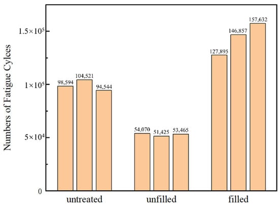 The fatigue test results of the thin-walled pipe are shown in Figure 15. When compared to untreated specimens, the fatigue-cycle number of the filled specimens treated with LSP was 144,128 (48.9% increase); when compared to unfilled specimens treated with LSP, the fatigue-cycle number of filled specimens treated with LSP increased by 172.0%. When LSP was directly applied to the thin-walled pipes, the fatigue performance was significantly lower, this being related to the chaotic residual stress field after LSP.