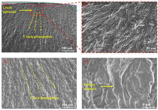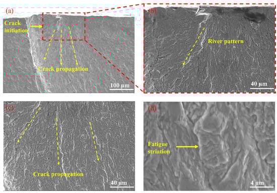 The fracture morphology of an untreated stainless-steel thin-walled pipe is shown in Figure 16. The fatigue source of the untreated pipe began on the surface of the specimen and then progressively extended to the surrounding region, as shown in Figure 16a,b. In the fracture source region, a typical river pattern morphology can be seen. The fracture morphology in the crack propagation region, as illustrated in Figure 16c,d, was primarily characterized by uneven fatigue striation, while the crack grew swiftly toward the inner material.