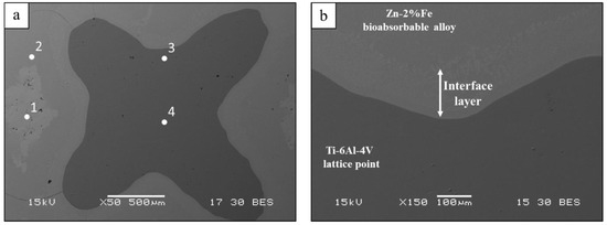 Close-up view of the boundary between the Ti-based lattice and the infiltrated Zn-2%Fe alloy as obtained by SEM back-scatter electron (BSE) imaging is shown in Figure 2. An EDS analysis was performed for the different identified areas as shown in Table 1: The first data point refers to a Zn-rich area, with a low number of Ti-6Al-4V components, which is assumed to comprise a Zn matrix and according to Kafri et al. [42]. The second data point refers to an area with large amounts of Zn along with a significant amount of the Ti alloy’s components and a lower Fe percentage, with a composition of [41]. Data point number 3 refers to the interface layer approximately 100 from the Ti-based lattice’s edge, which can be identified in a close-up view shown in Figure 2b. It comprises a significant amount of Ti, Al, and V, along with approximately 3.5% at of Fe, which suggests both and a ferritic phase are present. The 4th data point refers to the Ti-based lattice, which, as expected, mainly contains the elements Ti, Al and V, with very small amounts of Zn and Fe, which can be attributed to the large interaction volume of SEM EDS that could acquire a signal from deeper areas of the sample. The microstructure of Ti-6Al-4V lattice produced by SLM was composed of fine metastable martensitic α′ phase and small amounts of β phase [45]. The martensitic phase actually substitutes the regular α phase that is obtained in slower cooling rates at regular casting conditions.