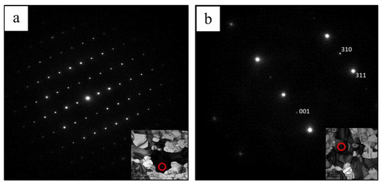 The two domains were further investigated to determine the phases present in each domain. SAED analyses of each domain are presented in Figure 4. Each domain was composed of one dominant phase. The first domain, with elevated amounts of Ti-6Al-4V components, was identified as an intermetallic ternary Ti-Fe-Zn phase [46]. This is supported by Gross et al. [47], as the identified phase is of -type structure, possibly based on Fd-3m structure (a = 1.3955 nm), where the Zr sites are replaced with Ti atoms, which share the same column in the periodic table, to create with a . The second domain was identified as , Pm-3m (a = 0.39322 nm), as anticipated.