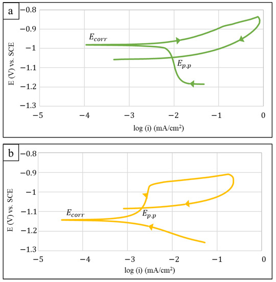 The cyclic potentiodynamic polarization analysis of the hybrid Ti-Zn system and Zn-2%Fe alloy is shown in Figure 5. The corrosion current of the hybrid system was relatively increased compared with the Zn-based alloy (2.4 [µA] vs. 0.3 [µA], respectively) along with an increased corrosion rate (3.6∙10−2 vs. 0.5∙10−2 [mmpy]), as presented in Table 3. The increased corrosion of the hybrid system mainly relates to galvanic corrosion attack that takes place between the cathodic Ti-matrix lattice and the Zn-based alloy. In addition, the protection potential (Epp) path in the case of the Zn-based alloy crosses the anodic branch above the Ecorr, while the Epp path of the hybrid system crosses the cathodic branch below the Ecorr. According to Peter et al. [48] and Stansbury et al. [49], this means that while the Zn-based alloy is generally sensitive to localized corrosion attack, the hybrid system undergoes pitting corrosion at surface defects. In our case, the surface defects in the hybrid system are the interfaces between the Ti-matrix lattice and the infiltrated biodegradable Zn-based alloy.